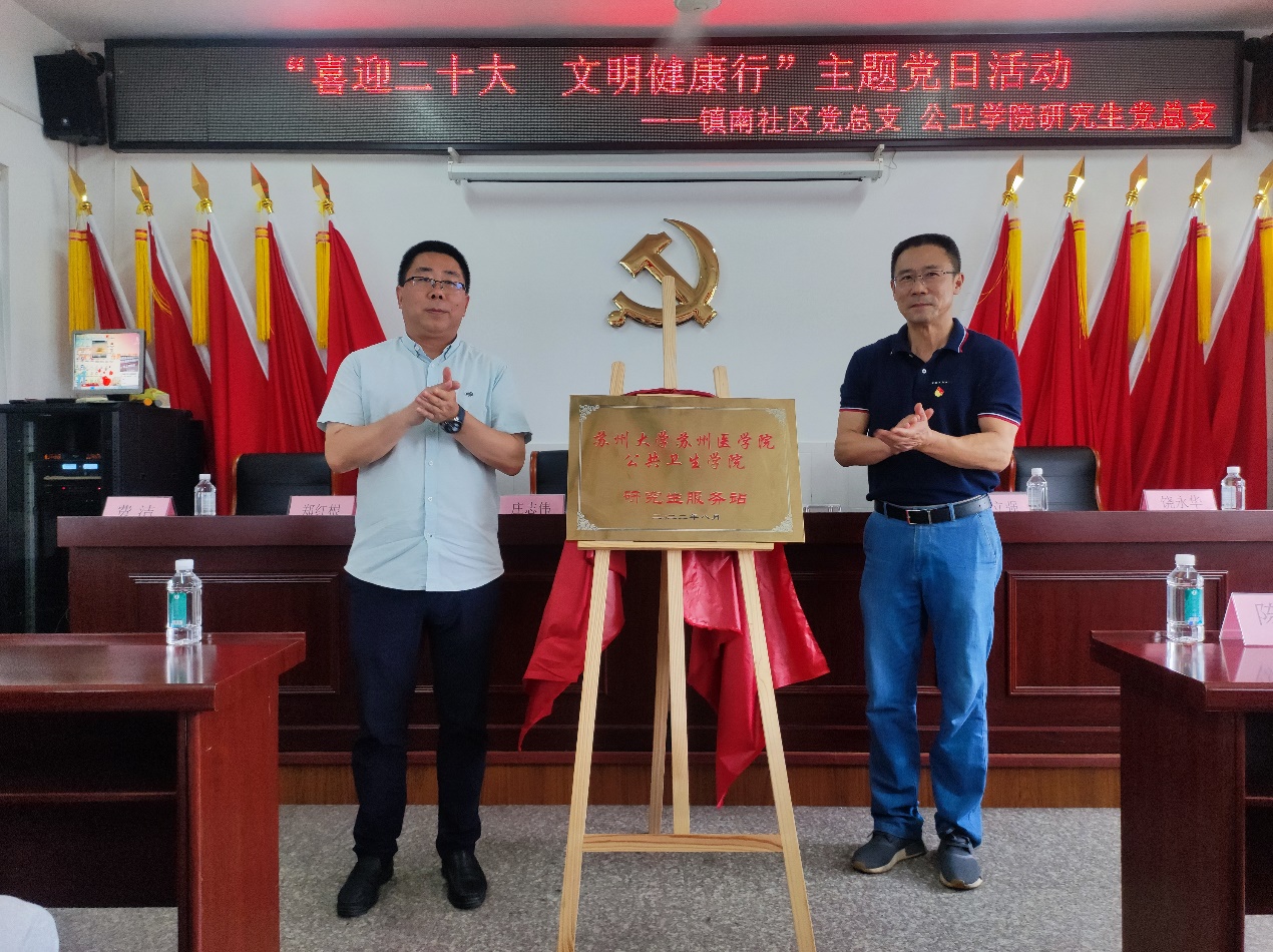为共同推进新时代公共卫生事业健康发展,将党建工作与公共卫生工作深入融合,全面提升公共卫生服务能力和水平,更好地满足人民群众的健康生活需要。8月24日下午,苏州大学公共卫生学院研究生党总支联合苏州市吴江区震泽镇镇南社区党总支开展“喜迎党的二十大 文明健康行”主题党日活动暨苏州大学苏州医学院公共卫生学院研究生服务站揭牌仪式,用实际行动迎接党的二十大胜利召开。震泽镇副镇长庄志伟、吴江区第四人民医院院长郑红根、震泽镇卫生办助理费洁、镇南社区书记汤永琴以及苏州大学苏州医学院公共卫生学院党委书记陈赞、副院长秦立强、综合办主任饶永华、研究生党总支书记陈玲出席本次活动。