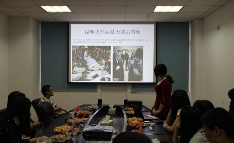 陆老师亲切而紧扣主题的讲话把活动推向了高潮。首先陆老师以自己的家人为例,强调了暴力事件已引起民众的普遍关注及不安定情绪,导致全国范围警戒加强。之后陆老师主要从以下几个方面对同学进行思想教育:(1)要有“中华民族大一统”的思想;(2)要坚决拥护党的领导,拥护我国现有的民族政策;(3)对待不同民族问题要“求同存异”;(4)对待问题及事件勿“冷漠”,这是最后一点也是最重要的一点。作为当代的研究生,我们不仅要关注与自己专业有关的事件,同时也需要关注民生,关注社会热点事件。我们要学会思考,思考怎样通过自己的努力能让社会多一分和谐多一分幸福。