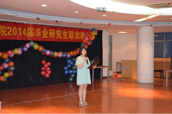 晚会伊始,芮书记致辞,他首先对研究生会、党支部、团支部精心组织联欢晚会表示感谢,同时感谢全体毕业研究生为学院的发展付出辛勤汗水,以及对导师们给予毕业研究生的辛勤培育表示感谢。其次,祝贺全体毕业研究生通过辛勤的努力顺利完成学业,特别是论文发表、科研成果、各类获奖等各项指标,都表明2014届是优秀的一届。最后芮书记对我们毕业研究生提出了殷切希望,他勉励走出校园的毕业生们要志存高远、脚踏实地,讲诚信、懂感恩,用自己的勤奋努力为母校争光,为祖国的建设出力。