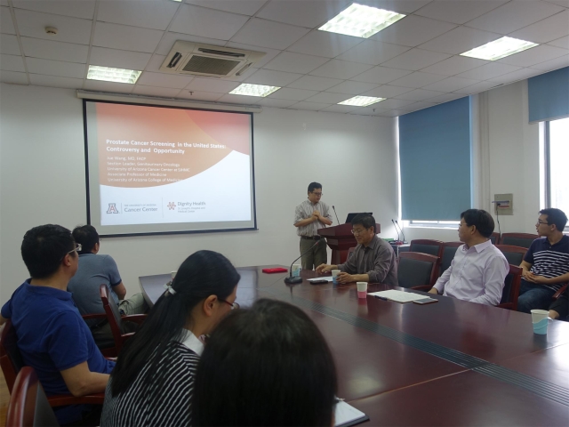 2016年5月26日星期四下午2点半,美国Arizona州立大学医学院副教授、University of Arizona cancer center at St Joseph Hospital 泌尿生殖肿瘤科主任、美国克莱顿大学医学院副教授王珏博士为我院师生作了题为《美国前列腺癌筛查的争论与展望》的学术报告。会议由学院张永红院长主持,芮秀文书记、各系(教研室、中心)负责人和学院老师、研究生及部分本科生等50多人参加了此次学术报告。