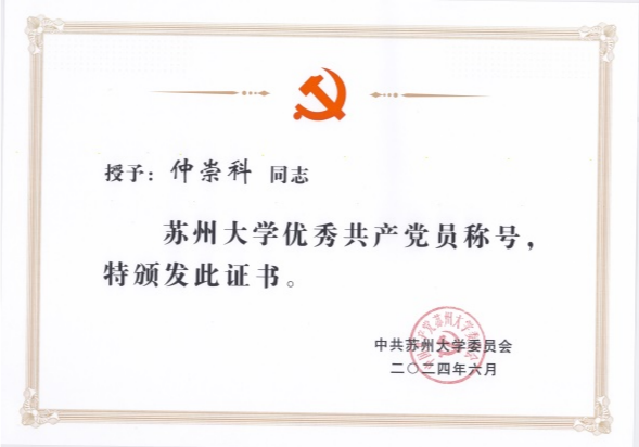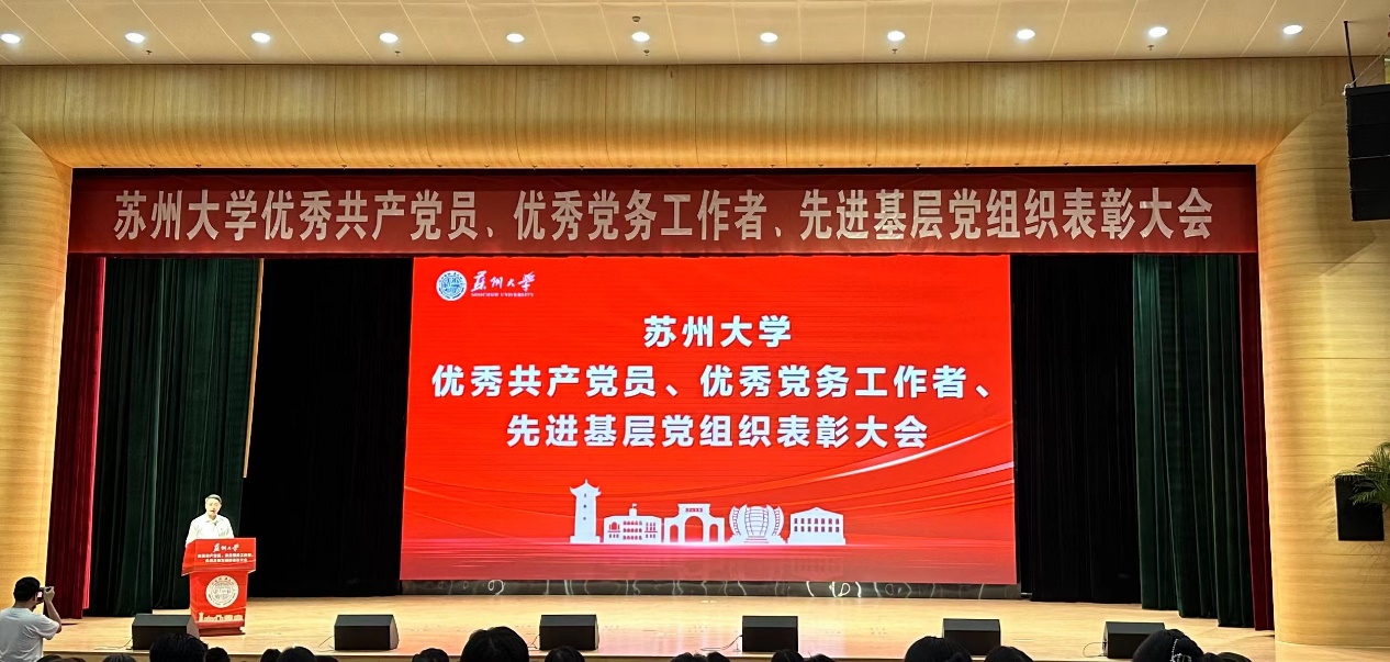 在天赐庄校区存菊堂召开的校优秀共产党员、优秀党务工作者、先进基层党组织表彰大会上,我院仲崇科老师荣获苏州大学优秀共产党员荣誉称号。研究生第一党支部荣获苏州大学先进基层党组织荣誉称号,研究生第一党支部副书记汤栋梁同学荣获苏州大学优秀共产党员称号。