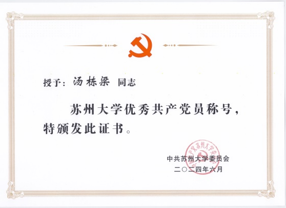 汤栋梁同学事迹介绍:曾获校优秀共青团员,优秀学生干部,第七届江苏省互联网+大学生创新创业大赛二等奖,优秀抗疫志愿者,苏州大学学业奖学金三等奖,第九届互联网+大学生创新创业大赛院三等奖,苏州大学学业奖学金一等奖,第三届全国大学生数据分析科普竞赛一等奖,“青春阿克苏·疆山守护者”荣誉称号,第八届大学生环保知识竞赛优秀奖等。组织参与了“以已之力 护卫健康”,“3·24世界防治结核病日”,“追寻红色足迹 感悟铁军精神”,“感悟科技竞争制高点 展望自立自强新征程”等主题党日活动。此外,关爱退休职工,走访慰问高龄退休同志教授,到退休教职工气排球友谊赛为老同志服务。在“逐梦白水城,青春阿克苏”全国高校实践活动中,获得“青春阿克苏·疆山守护者”称号。在苏州新冠疫情爆发,主动参与到学校的疫情防控工作中,坚守阵地。同时主动报名前往苏州市疾控开展疫情防控工作。