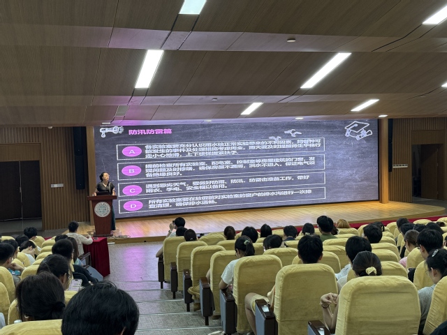 本次培训主讲人为苏州医学院实验室管理办公室蒋芸老师,学院兼职安全员、全体留校研究生及本科生共200余人参加了本次培训。培训会上,蒋芸老师结合日常实验室检查典型案例,系统讲解了暑期实验室防汛防雷、防火防爆、防中暑、防操作不当、防他人不规范操作及防 “坏人”等核心内容。通过“AI情景模拟+互动问答”形式,重点演示了各类突发状况下的防范策略、现场研判要点与应急处置步骤,参训师生覆盖率达100%。
