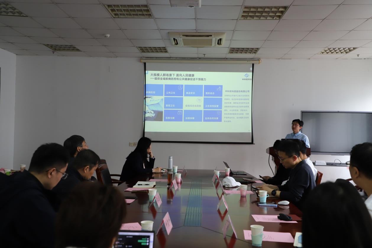 秦立强副院长详细介绍了公共卫生学院的发展历程、学科特色、科研实力与人才培养概况。中科软公共健康部负责人丁海元介绍了公司的技术优势、业务布局以及在公共健康领域的实践积累。