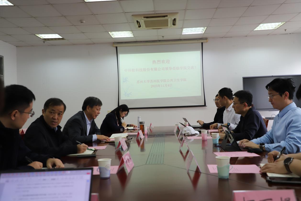 2025年11月4日,中科软科技股份有限公司(以下简称“中科软”)总裁助理刘继增、公共健康部负责人丁海元、清华大学万科公共卫生与健康学院底骞副教授、中科软区域总监王琳、重客负责人张辉等来院交流。学院党委书记芮秀文、副院长秦立强、副院长张洁、、工会主席孙宏鹏、骨干教师孙宏鹏、仲崇科、陈国崇、汤在祥、谷魁英、柯丽媚等参与交流。会议由芮秀文主持。