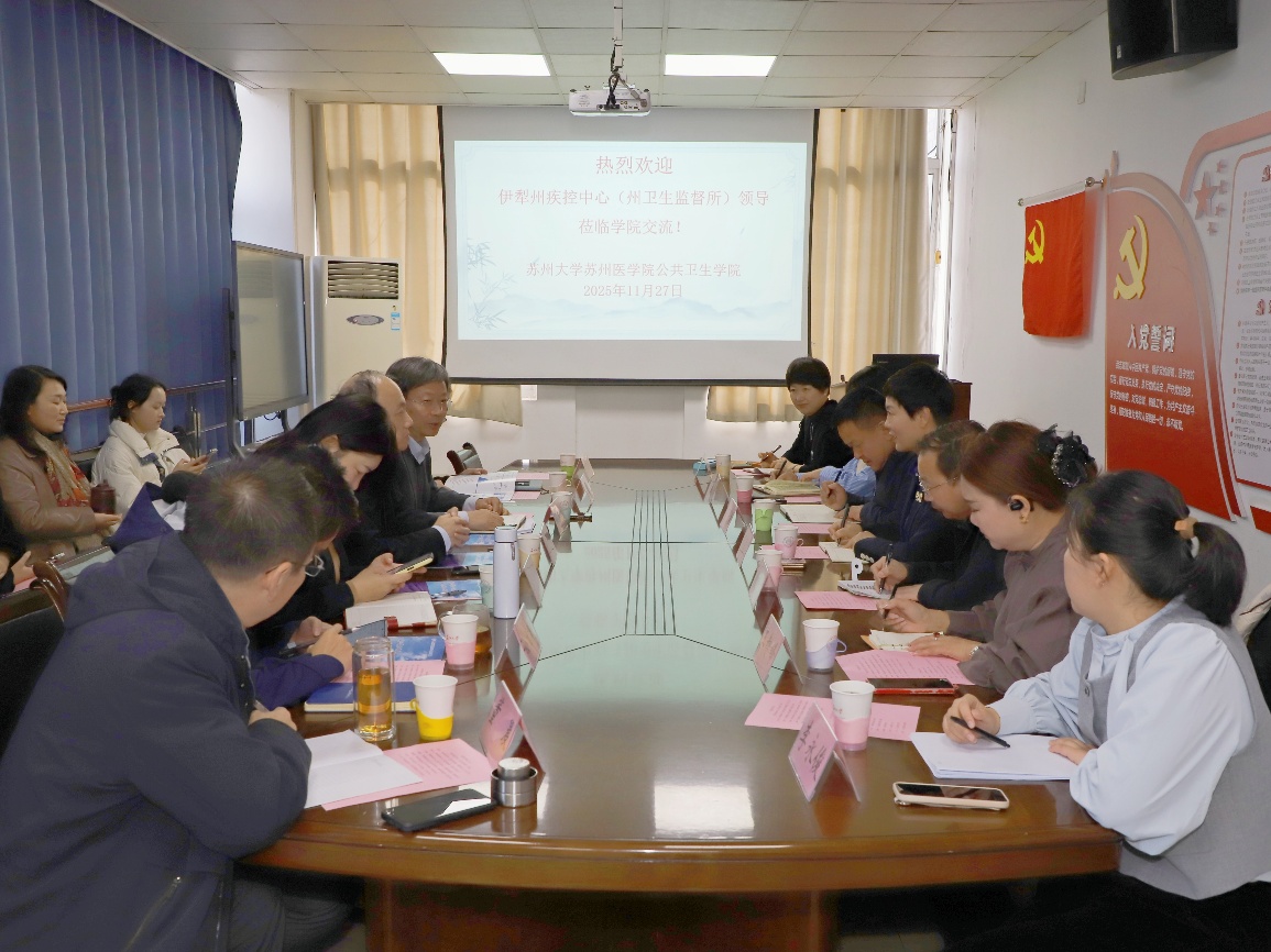 2025年11月27日下午,苏州大学苏州医学院公共卫生学院与伊犁州疾控中心(州卫生监督所)合作交流座谈会在苏州大学独墅湖校区医学楼可园会议室举行。伊犁州疾控中心(州卫生监督所)党委副书记、主任(所长)王菊萍,党政办公室主任周科文,新源县疾控中心(县卫生监督所)卫健委党委委员、党支部书记丁得勇,巩留县疾控中心(县卫生监督所)卫健委党组成员、党支部书记王智峰,以及健教科科长杨盛梅、艾防科科长李永俊、办公室刘燕等一行到访。苏州大学公共卫生学院张增利院长、党委书记芮秀文、张洁副院长,院长助理雷署丰、工会主席孙宏鹏、教工支部书记万忠晓、仲崇科、谷魁英博士、学院办公室张楠、饶永华等参加座谈会。座谈会由芮秀文书记主持。