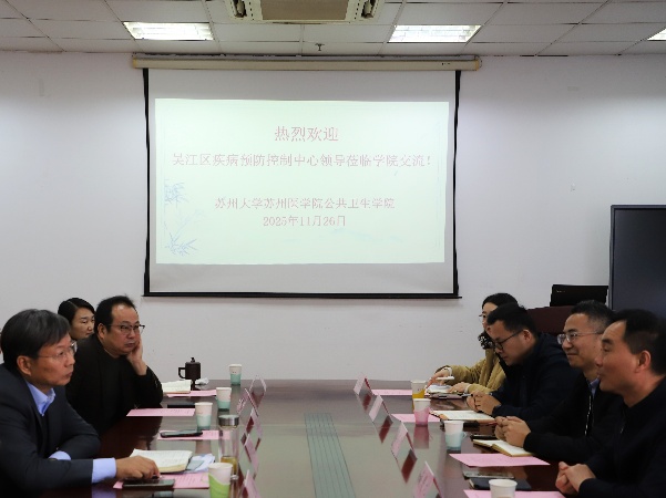 2025年11月26日上午,学院与吴江区疾控中心深化合作座谈会在杏林会议室顺利召开。苏州市吴江区疾病预防控制中心党组书记、主任薛爱龙、副主任蔡伟钧、陆爱明、彭浩,质管办科长严坤,办公室主任葛婳姣;学院院长张增利、党委书记芮秀文、副院长秦立强、院长助理雷署丰、工会主席孙宏鹏、教工支部书记仲崇科、专职组织员张楠、综合办公室主任饶永华等参加座谈会。座谈会由芮秀文书记主持。