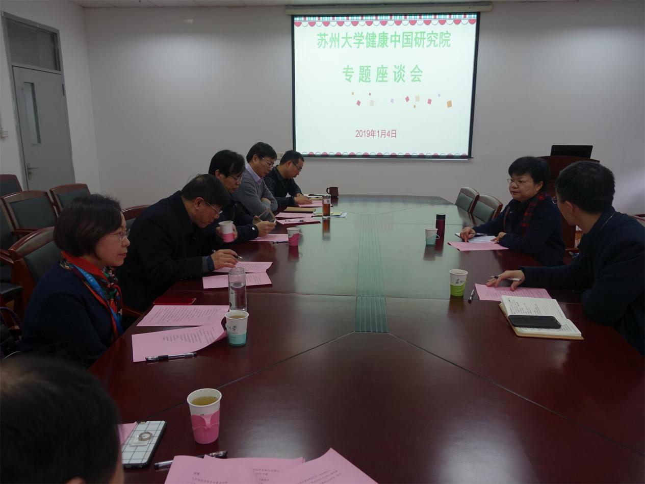 2019年1月4日上午9点,为更好的推进苏州大学健康中国研究院总体工作,苏州大学健康中国研究院学术委员会成立暨首次工作会议相关事宜专题座谈会在我院杏林会议室顺利举行。苏州市卫计委副主任卜秋、苏州市卫计委爱建办副主任刘俊宾、苏州大学科技部部长郁秋亚、医学部副主任龙亚秋、学院张永红院长、芮秀文书记等领导出席了座谈会,学院各系(室、中心)负责人也参加了座谈会。