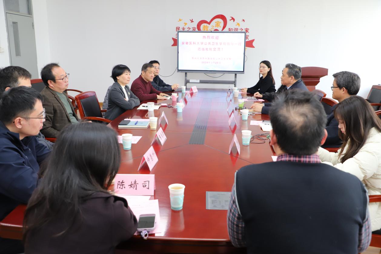 2026年3月20日上午,安徽医科大学公共卫生学院党委书记马军成、副院长潘海峰一行来院交流。学院党委林萍书记、秦立强副院长及教师代表参加座谈。座谈会由林萍主持。