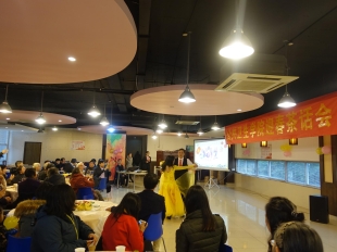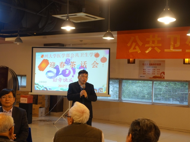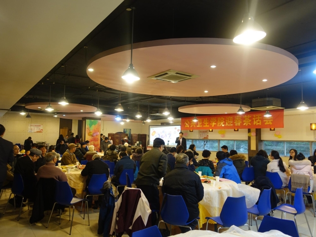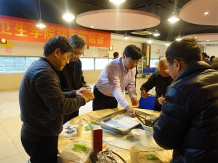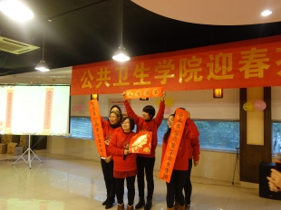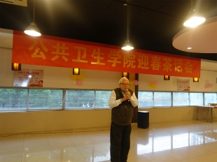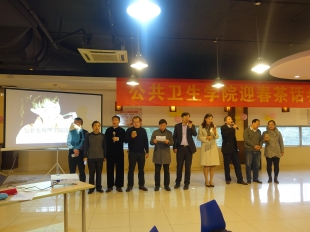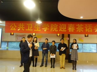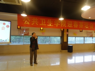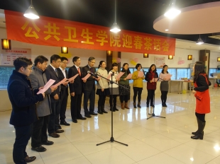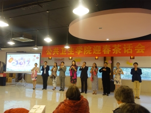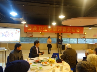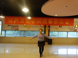 茶话会开始,芮秀文书记首先致辞。他向学院全体在职和离退休教师介绍了一年来学院在学科科研、人才培养、行政保障和社会服务等方面所取得的成绩,同时感谢全院师生为学院发展所作出的贡献并祝愿全体教师在新的一年中身体健康,万事如意。全院教工积极参与迎新活动,并准备了丰富多彩的迎新文娱节目,节目以流行病与卫生统计学系教师的小合唱《年轻的朋友来相会》拉开序幕,常杰和张天阳老师娓娓动听的一首日语歌《北国之春》随之而来。我院的诗人肖卫老师朗诵了《水晶天台秋歌远》。霍金芝老师的扇子舞《红梅赞》、80多岁李清碧老师的清唱和俞政老师京剧表演让我们感受到离退休教师的多才多艺。更让我们年轻老师感到不可思议的是米志苏老师的恰恰舞,这难道是70多岁的老师在跳吗?活力四射!
