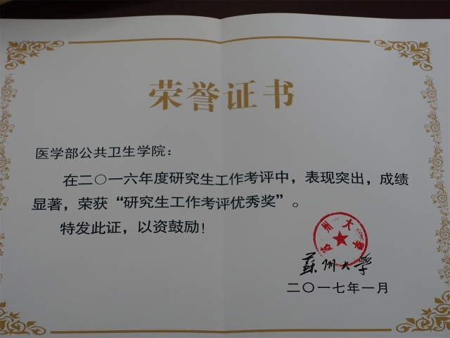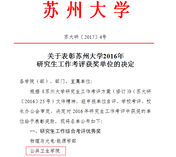 经过全院师生的共同努力,在过去的一年中学院在研究生工作方面成绩显著,获评2016年度苏州大学“研究生工作综合考评优秀奖”。
