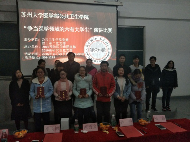 为了促进我院新生在当前医学新形势下树立远大理想、更加热爱预防医学专业,在我院党委的大力支持下,教工第二党支部联合2016级预防医学团支部和2016级研究生党支部于11月27日周日晚在301-1219报告厅举办了“争当医学领域的六有大学生”主题演讲比赛。我院党委芮秀文书记、医学部学工办孙静副主任、教工第二党支部代表邓飞艳、尹洁云、陆鑫老师参加了此次活动。