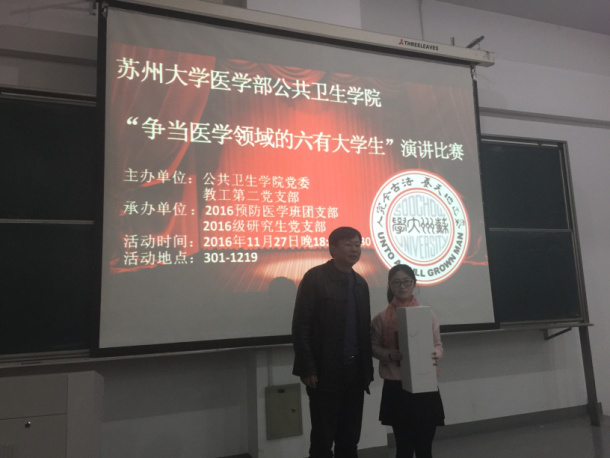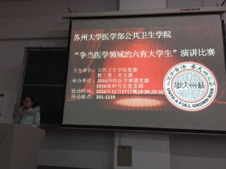 为了促进我院新生在当前医学新形势下树立远大理想、更加热爱预防医学专业,在我院党委的大力支持下,教工第二党支部联合2016级预防医学团支部和2016级研究生党支部于11月27日周日晚在301-1219报告厅举办了“争当医学领域的六有大学生”主题演讲比赛。我院党委芮秀文书记、医学部学工办孙静副主任、教工第二党支部代表邓飞艳、尹洁云、陆鑫老师参加了此次活动。