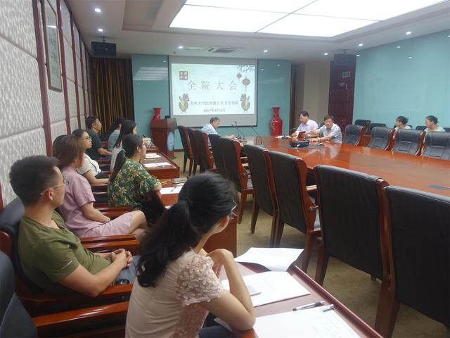 芮秀文首先就近期成绩进行了通报,今年学院取得了12项国自然基金的好成绩,基金数首次达到2位数;园区CDC获评我校今年唯一一个优秀省研究生工作站,4家研究生工作站成为省研究生工作站;沈月平老师团队的《医学统计学》成功获评省级外国留学生英语精品课程,我校仅有2门课程获评。这是全院上下共同努力的结果,也恰好说明了只要我们顺势而为而且永不放弃就一定能取得好成绩的道理。接着,芮秀文传达了上级相关会议精神,重点传达了江涌书记和熊思东校长在校党委十一届十八次全体会议和干部大会上的讲话精神,以及校小金库专项治理“回头看”工作会议、党务工作例会、迎新工作会议和全国公共卫生院长会议精神。最后,他还对学院今年下半年的工作进行了布置,首要的就是校十二次党代会的相关工作,同时也要积极做好“两学一做”学习教育常态化制度化工作;其次要积极做好研究生和本科生的迎新工作,尤其是今年将首次召开本科生新生家长会,全院要高度关注;第三,本科生导师制需要全院教职工全员参与,希望人人做好学生成长的引路人,使导师制切实产生实效。