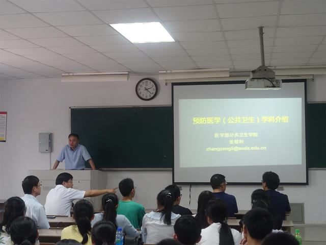 张增利副院长向新生着重介绍了预防医学的内涵,内容及就业途径和前景等,同时特别强调大家对于大学目标(表达、批判性思维、逻辑推理、公民意识、适应多元文化、全球化、广泛性等)要积极适应并注重相关品格和能力的培养。随后各系负责人分别就各系的基本情况进行了详尽的介绍。老师们的详尽介绍使同学们对于预防医学有了更进一步的了解和认识。
